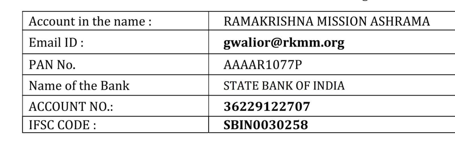 The Ramakrishna Mission Ashrama, Gwalior welcomes the public to take part in carrying out various types of work chalked out by Swami Vivekananda for serving humanity. We are cordially invited to help us by contributing to one or more of the Funds, which need their active support.
